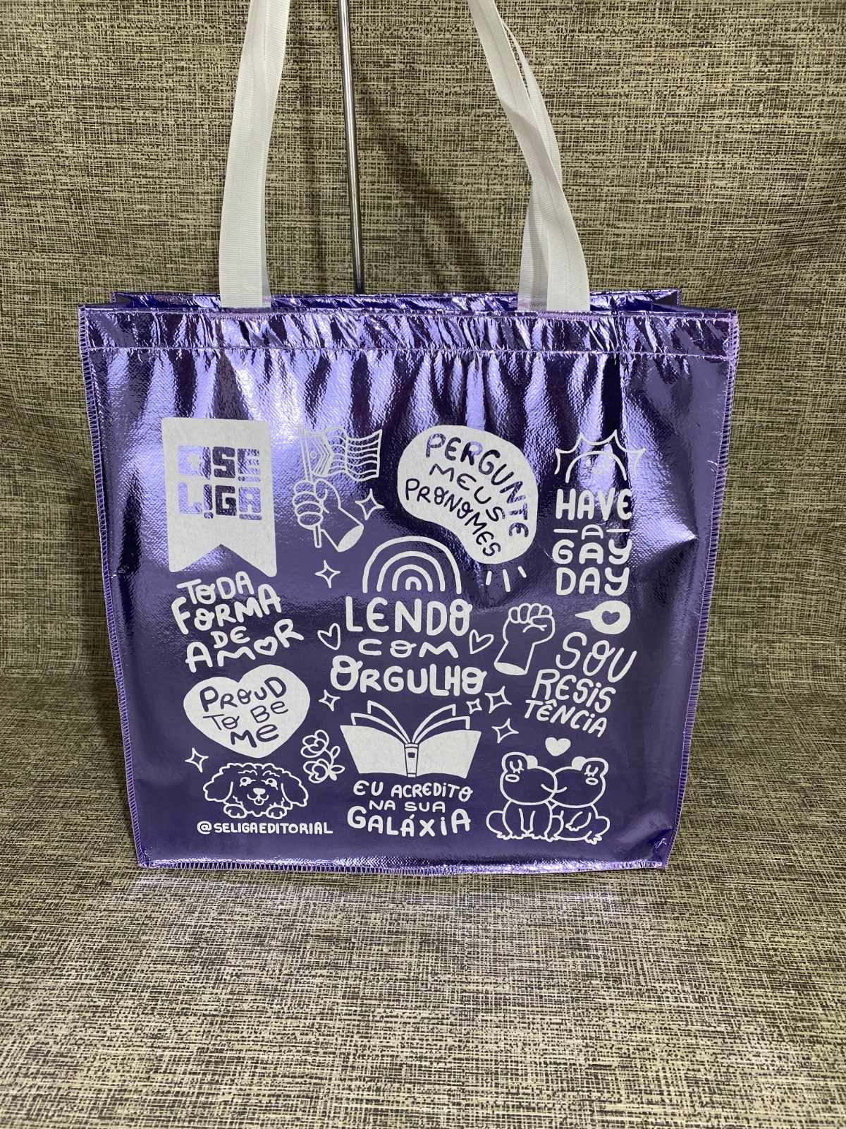 Ecobag roxa brilhante com estampa exclusiva criada pelo ilustrador André Inácio.